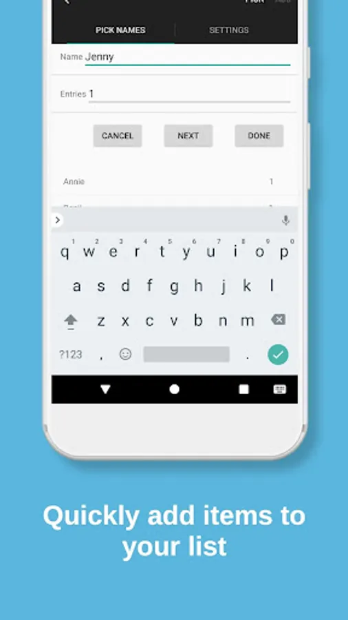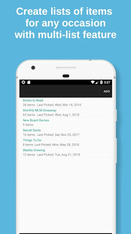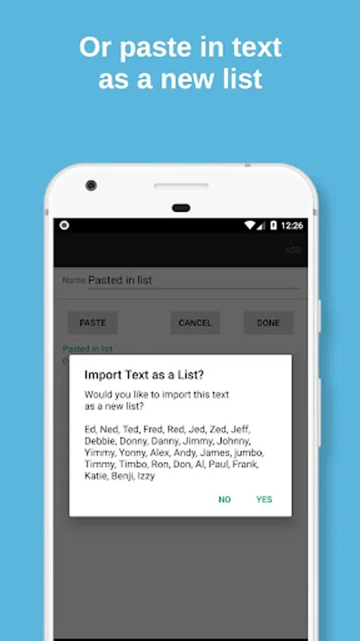 • Paste in text as a new list! Copy names to your phone's clipboard with commas, tabs, or newline characters separating each name. Tap the Add button, name the list, and tap the Paste button to import all the copied names into the list. Each name will receive 1 entry.