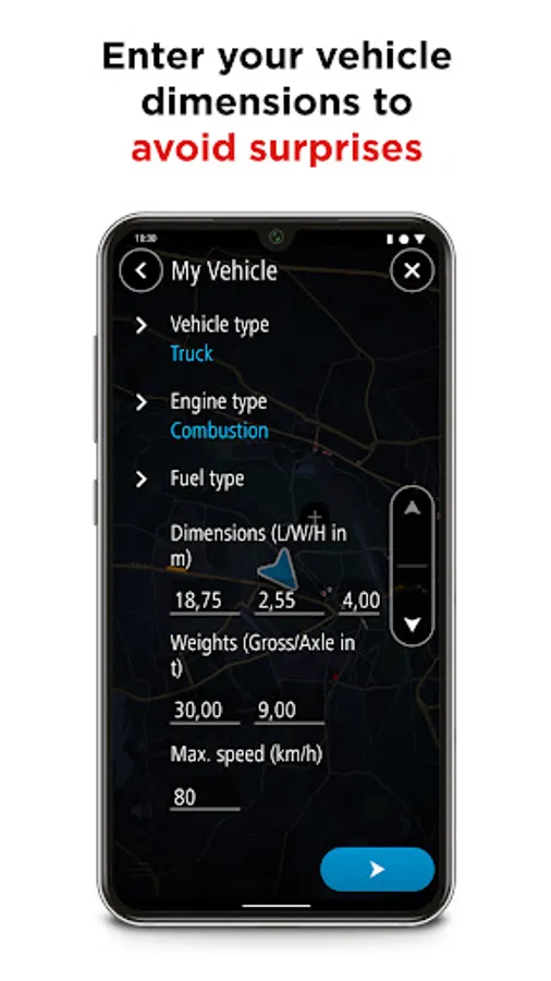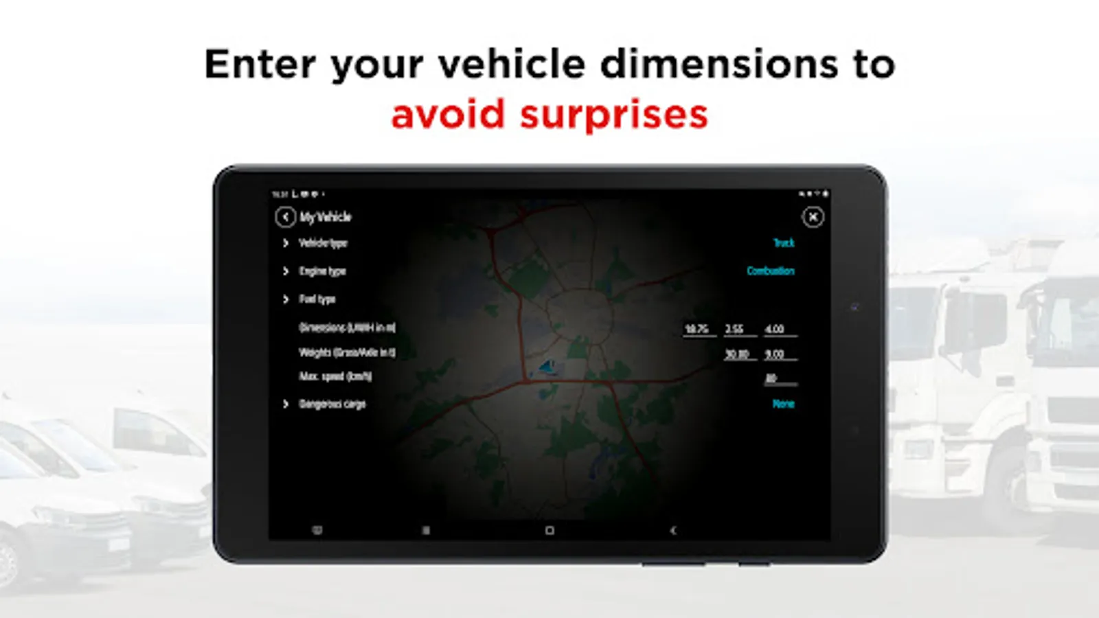 - Specify your vehicle’s dimensions to get routes tailor-made for your vehicle