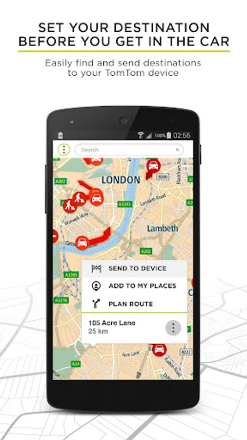 Choose the best route to take before you get in the car. Share your destination with a compatible TomTom GPS device for navigation through traffic.