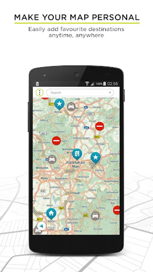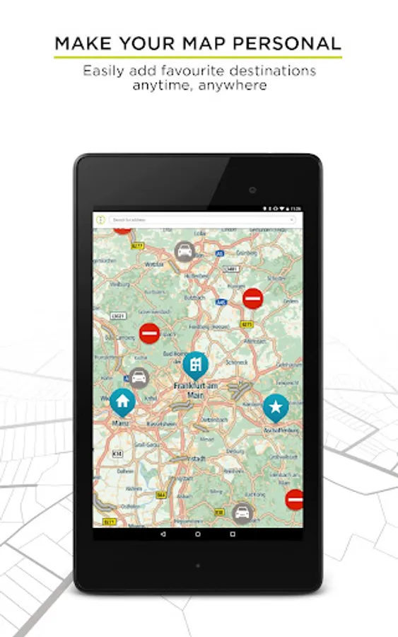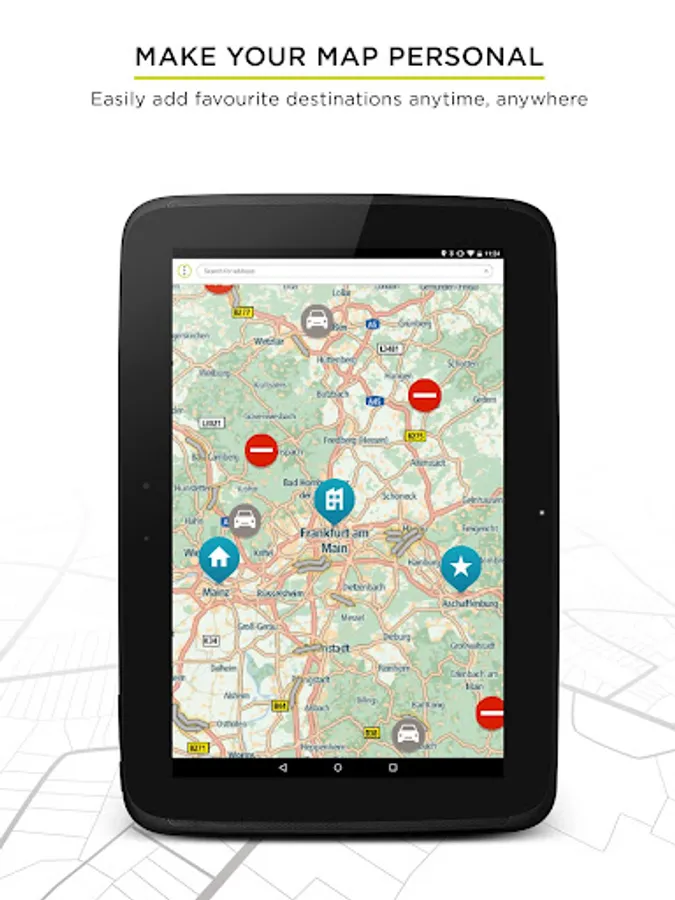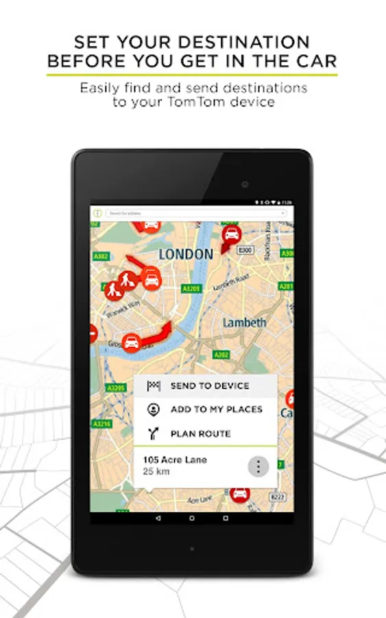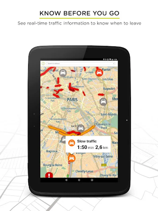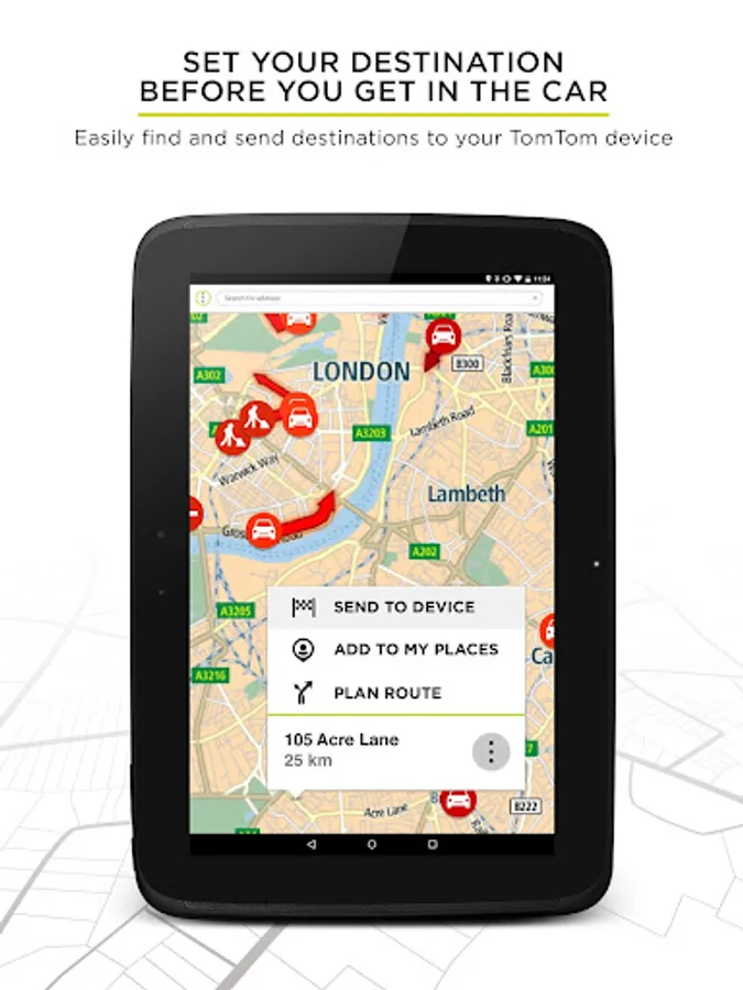 >> Set where you’re going using phone contacts, saved favorites, a tap on the map, or just type it in. Then send it to your GPS device and it will guide you through traffic.