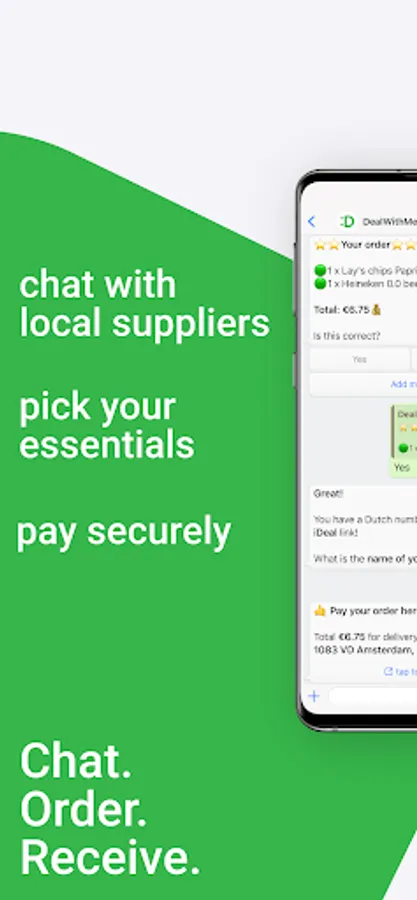 Via DealWithMe you can easily order everyday groceries via Whatsapp. We present you in an overview what is offered in your area. You then choose the products and pay securely.