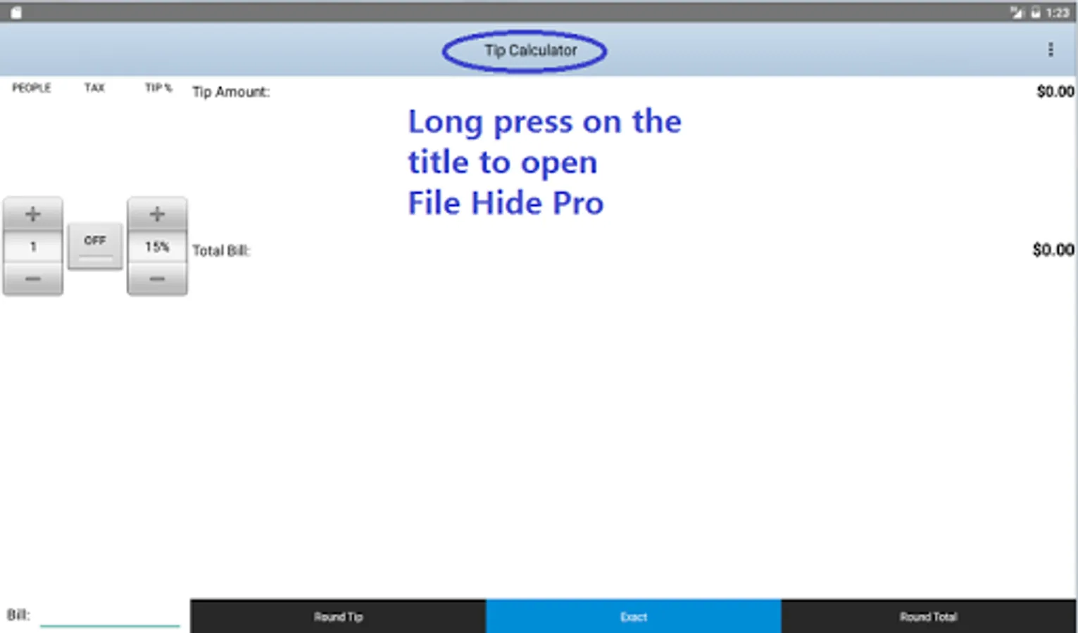 You can long-press on the title, i.e., "Tip Calculator" to open File Hide Pro. Password protection is also provided to secure this app further!