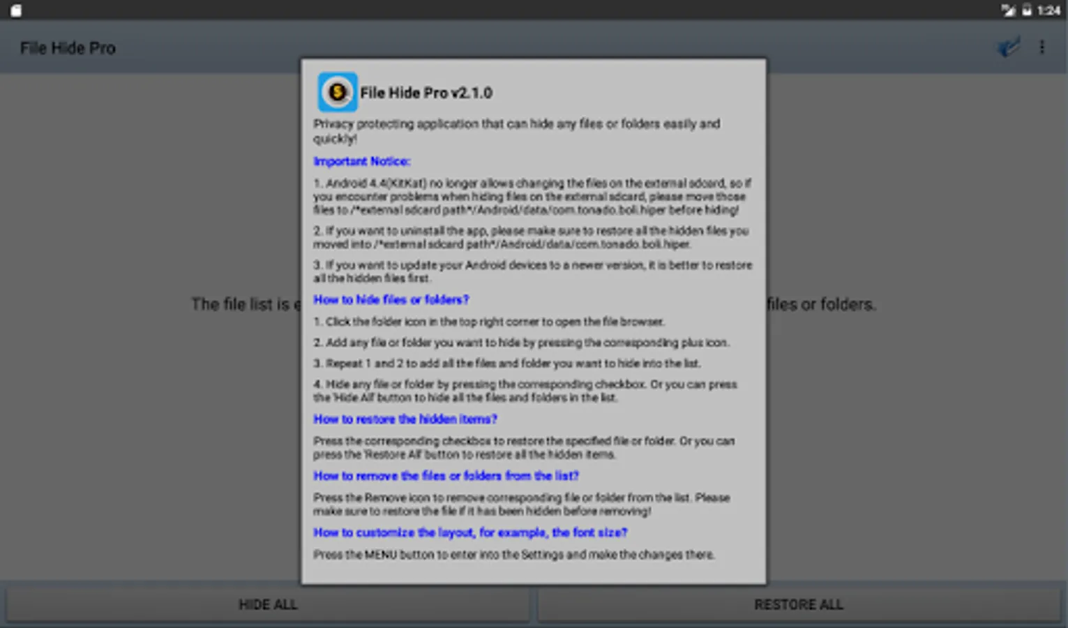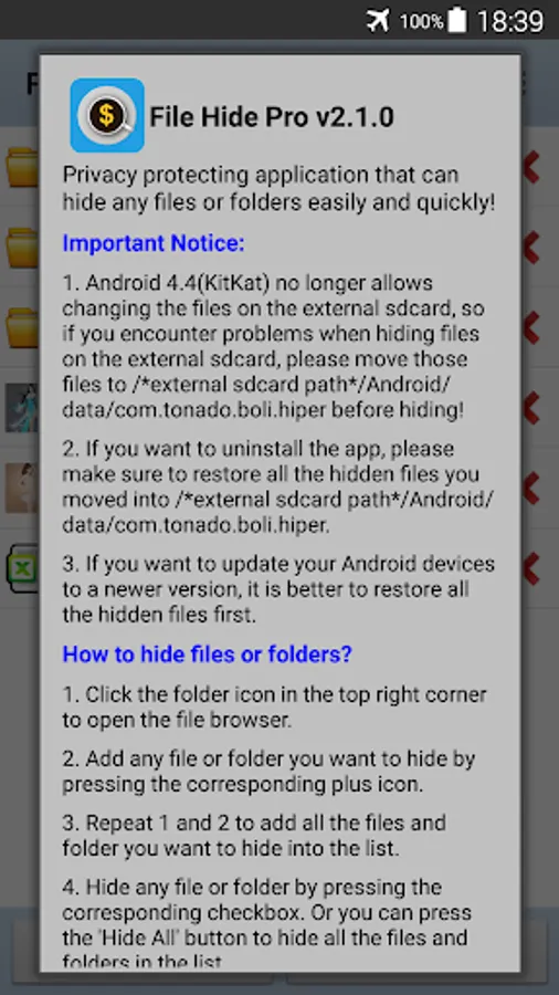 To the Android 4.4(KitKat) users who have an additional external SD card(most are Samsung users): Android 4.4(KitKat) no longer allows the files on the external SD card to be changed, so *if* you experienced problems when try hiding files on the external SD card, please first move those files to /*your external sdcard path*/Android/data/com.tonado.boli.hiperpro before hiding!