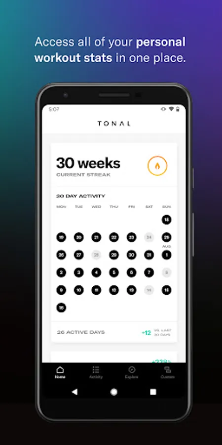 - • Track your progress: See your strength grow. Tonal’s A.I. keeps track of your workouts, measuring your progress and breaking it down by muscle group and workout type.