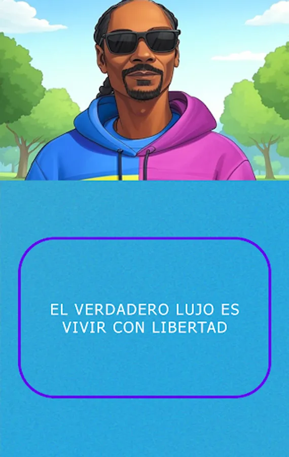 Immerse yourself in the unique style of Snoop Dogg, a hip-hop legend. Each touch on the screen brings you a new phrase full of flow, attitude and wisdom about life, music and success.