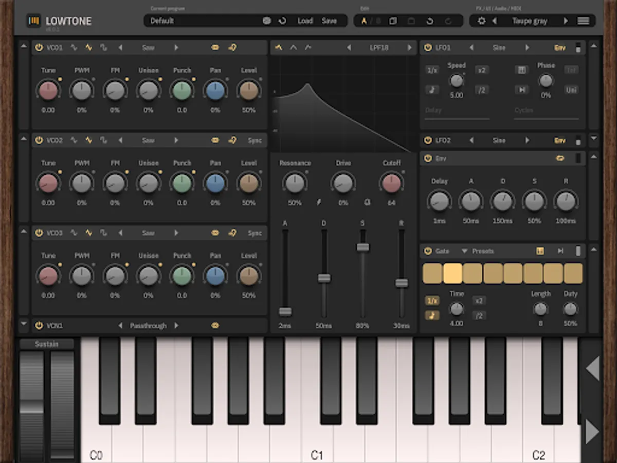 TB Lowtone is an innovative bass synthesizer app featuring three analog-simulated, voltage-controlled oscillators with a large variety of waveform algorithms, continuous pulse-width modulation (PWM), Frequency Modulation (FM) and oscillator hard sync, complemented by a voltage-controlled noise synthesizer, parameter modulation a re-designed non-linear voltage controlled filter.