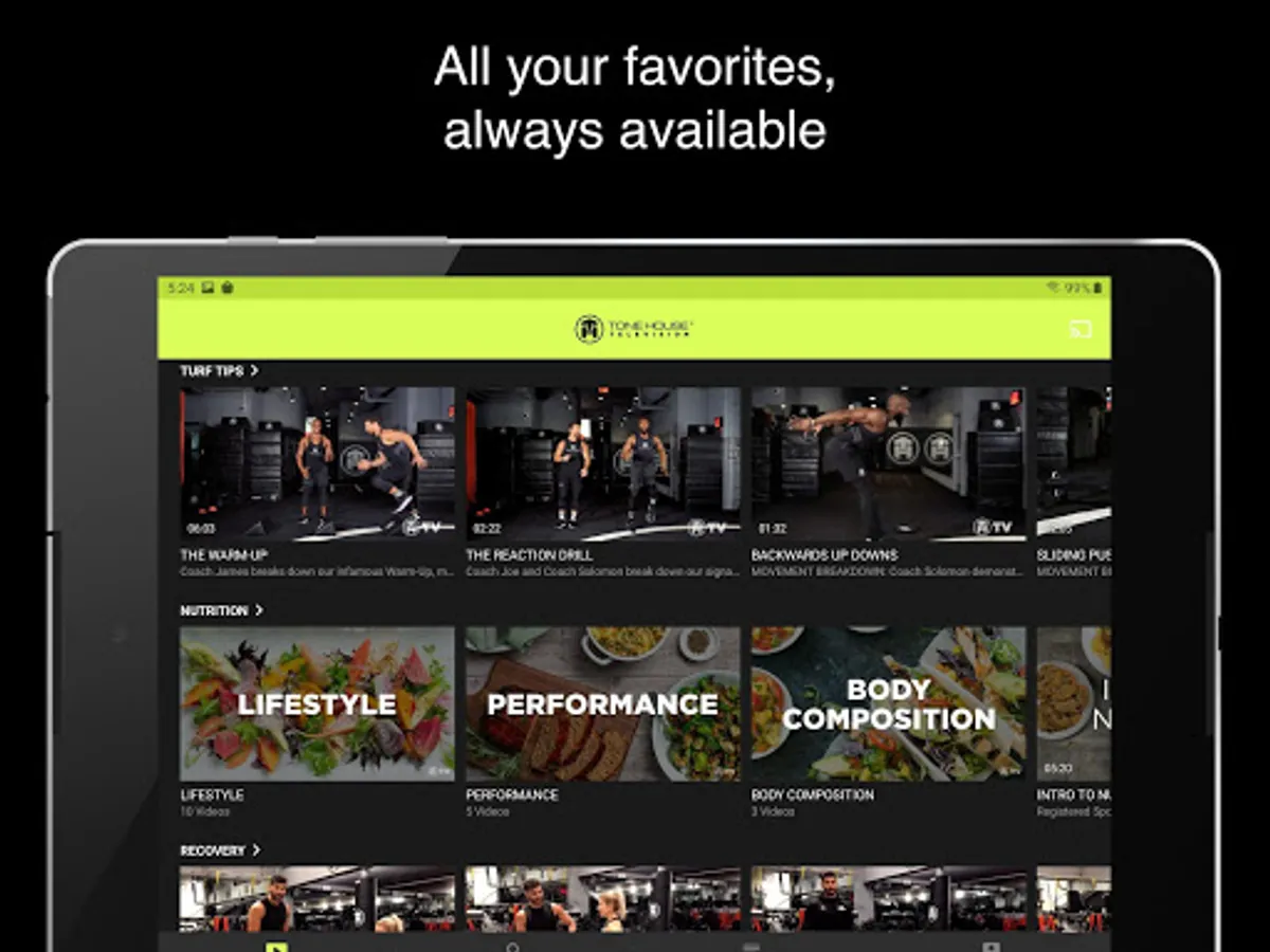 Unlimited Tone House workouts delivered straight to your favorite devices. Complete hundreds of virtual Strength & Conditioning workouts from anywhere in the world, with our world-class Coaches by your side. Filter by body focus, workout length, favorite Coach, or the exact type of results you're looking for. Expert Nutrition guidance is baked right into the app, with healthy recipes and fueling guidance from our team of RDs. Minimal equipment required (dumbbells, sliders, and cones) to complete most workouts. Got access to a gym? Follow along with our barbell-based videos for guided strength training programs straight from our Turf to yours.