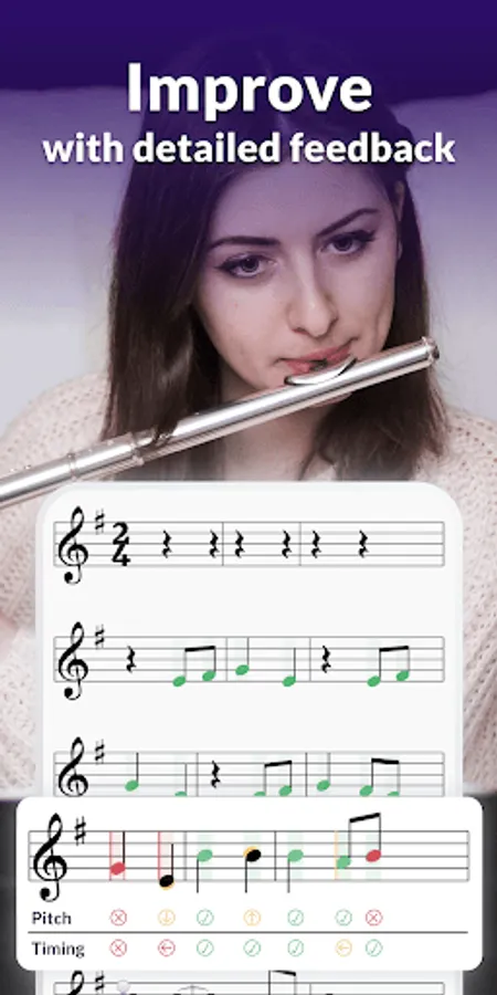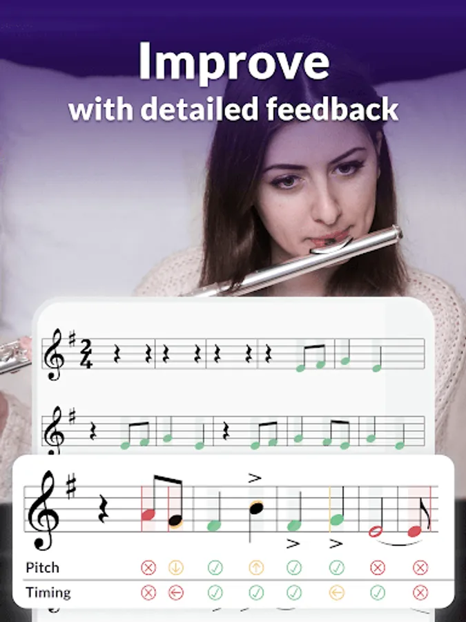 Learn to play the transverse flute and improve on rhythm and pitch. tonestro listens to you while you play the flute and gives you immediate live-feedback on rhythm and pitch. A tuner lets you tune your flute easily.