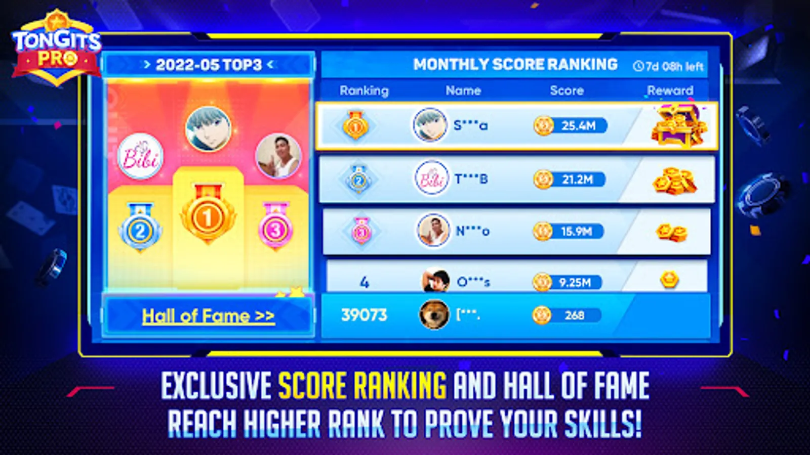 Exclusive score ranking system.With a high level of skill, you will stay in the Hall of Fame and will be shown to all players. The longer you stay, the more reward you win!