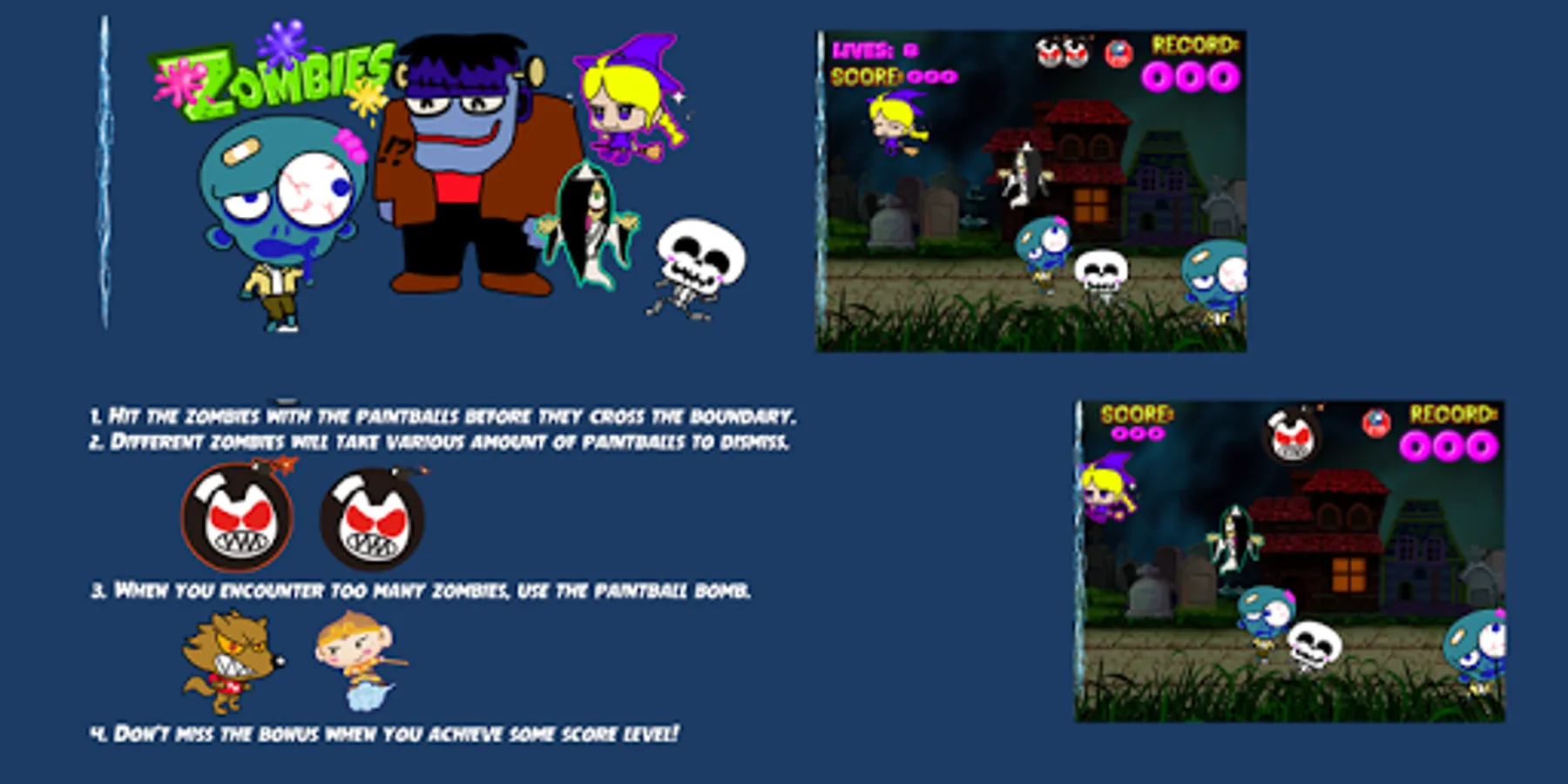 1. Hit the zombies with the paintballs before they cross the boundary.