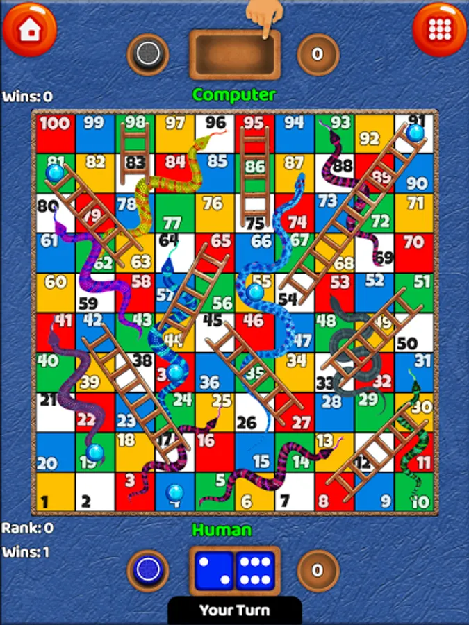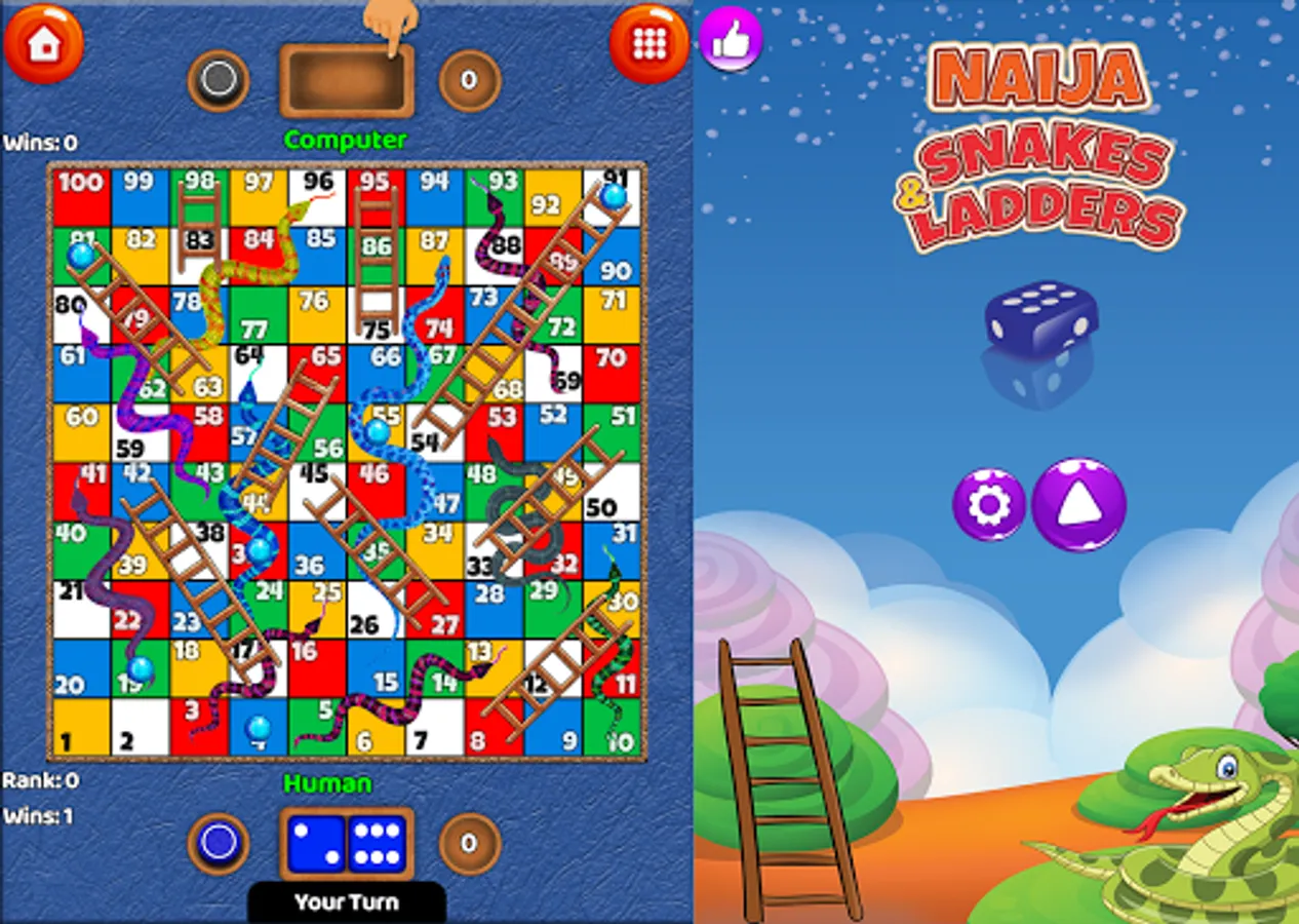 Naija Snakes and Ladders is very easy to play. Tap the dice at the middle of the board to roll the dice and tap on the round button below to move your piece. If your piece stops at the head of a Snake, it must be returned to the tail of the snake but if your piece stops at the bottom of a ladder it must move to the top of the ladder.