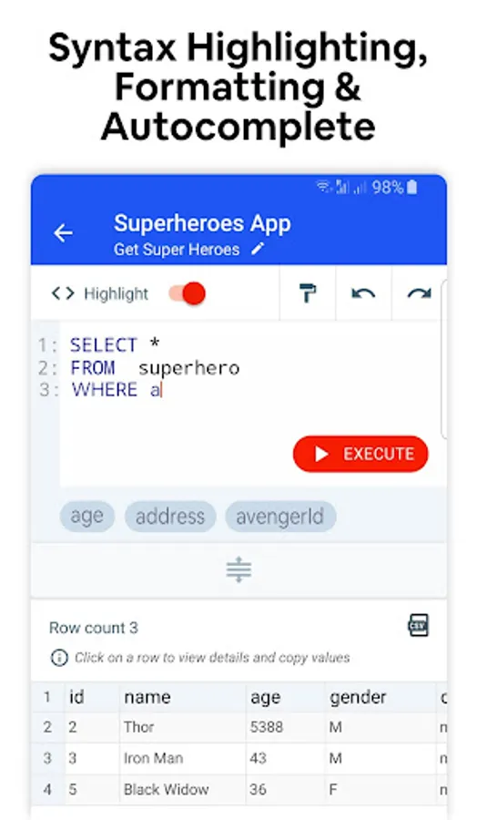 - Powerful query editor with syntax formatting, highlighting & auto-complete