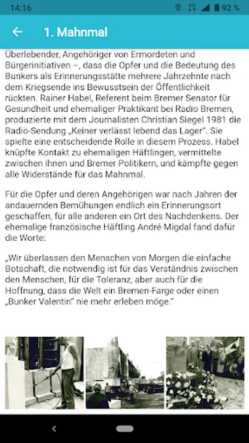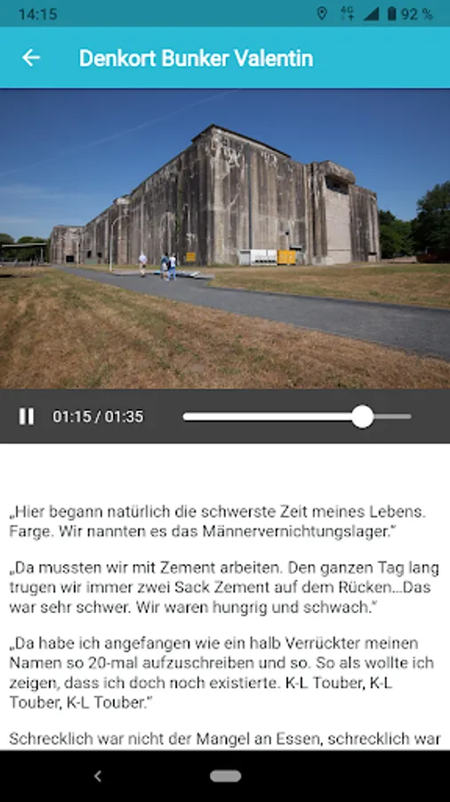 Today, the "Valentin" bunker is a place of remembrance. With this app, you can learn more about the history of the site. Along the circular route, it offers you eyewitness interviews and other historical material.