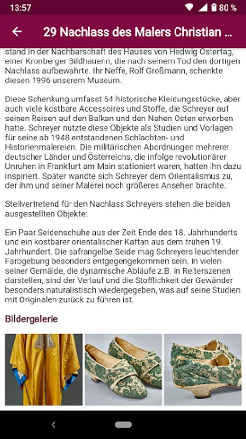 The audio tour presents the selected objects, which represent entire areas of the collection, in the history of their creation. You can hear the audio tour, read texts and look at the objects as a picture in peace. For some objects, music can be heard in the audio tour. It either indicates the time in which the respective object was created or was even recorded on the historical instrument presented.