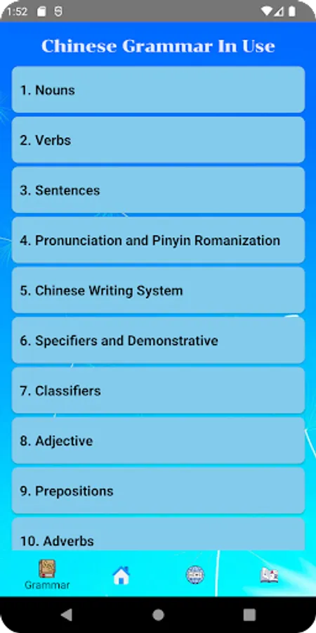 * Supplying to user most important Chinese grammar structures used in daily life.