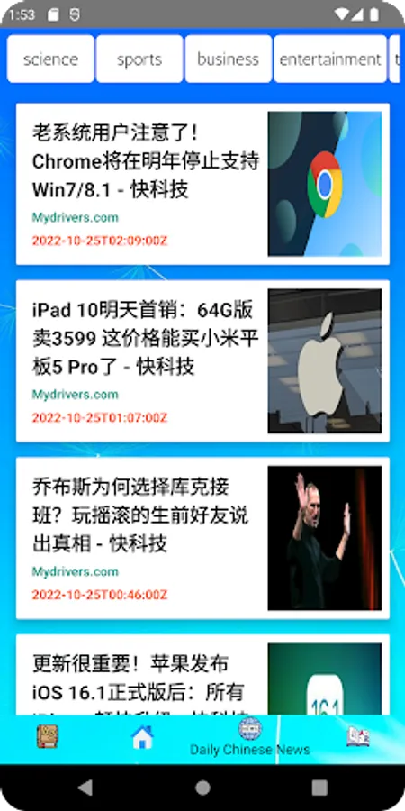 * Chinese News function help users improving reading skills by daily news in economic, sports, technology, health, business...