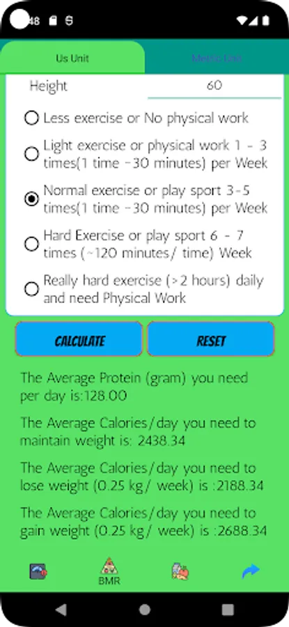* Calculating how much protein user need a day, how much calories user need per day to maintain, lose or gain weight.