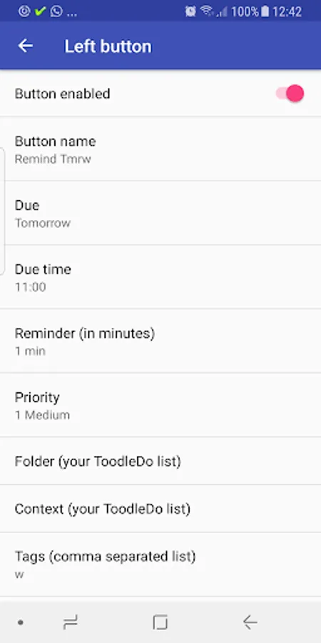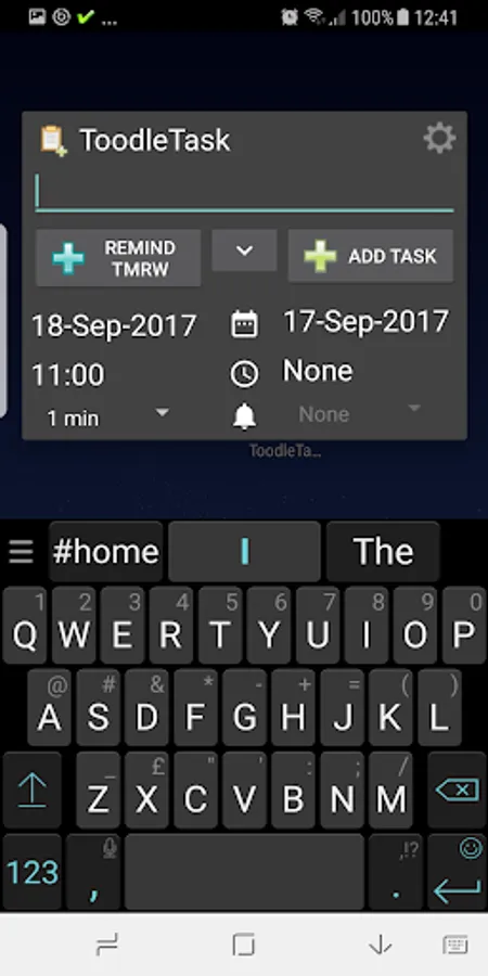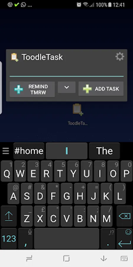 ToodleTask is a very small, lightweight app for easily entering tasks into ToodleDo. From just one press on the homescreen, you can begin typing immediately. Default values can be set for the tasks, and quick override buttons are available. To access settings, use the cog icon in the top right.