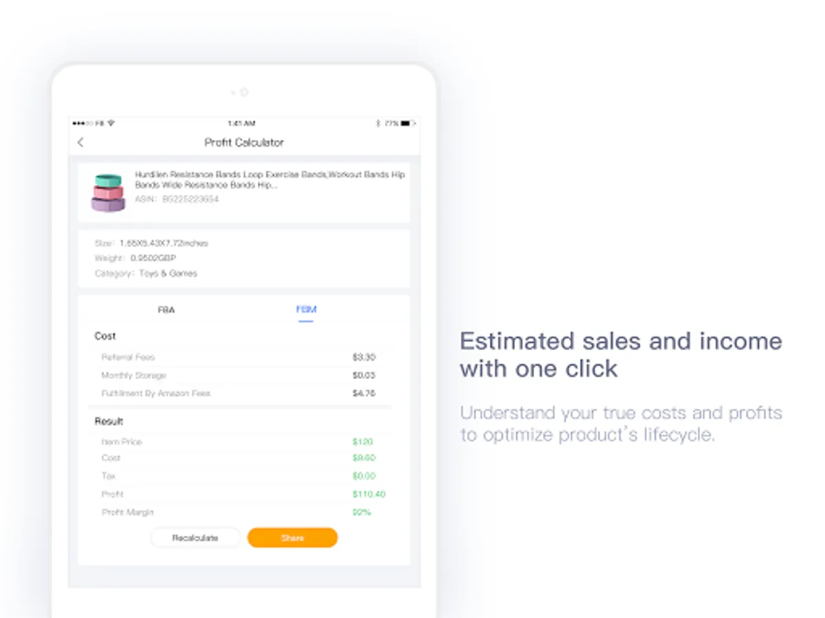 To ensure your sales are profitable, FBA Profit Calculator for Amazon Sellers is designed for helping calculate the various costs and margins accurately.