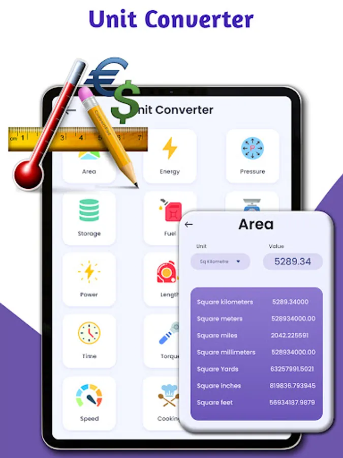 For unit conversions, this app includes a Conversion Calculator and Multiple Unit Converters. Convert the unit's weight, area, volume, etc. quickly and easily with this unit converter. Using our BMI Calculator, keep your weight in check and stay healthy
