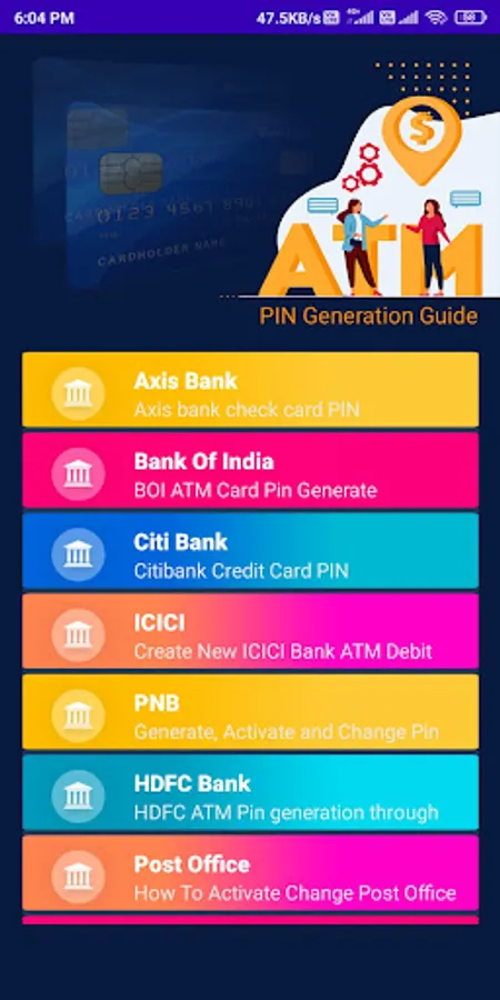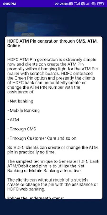 In this app (Atm pin generate app guide) we tried to provide online atm pin change process with other essential detals included in it. Also we introduced offline update mode like card pin generation through phone call in some of the details for easy accesss.