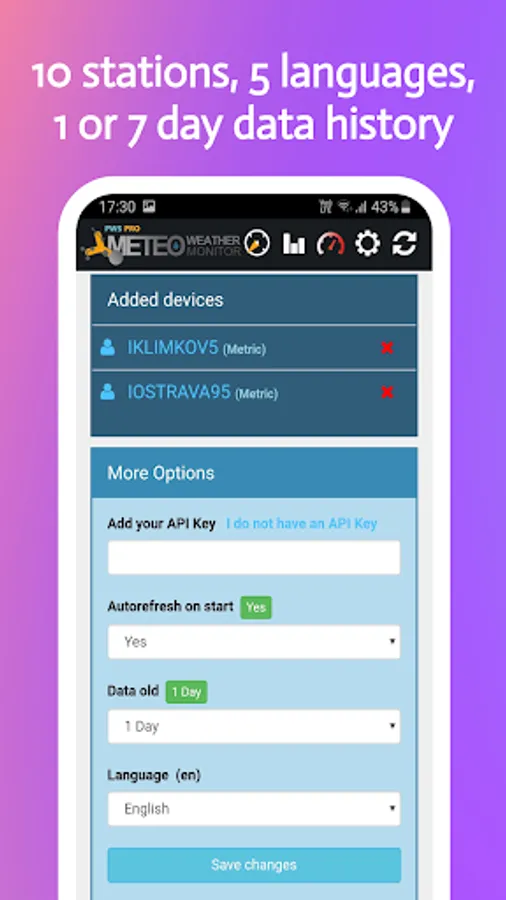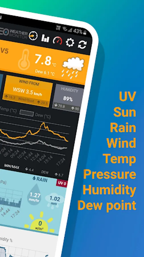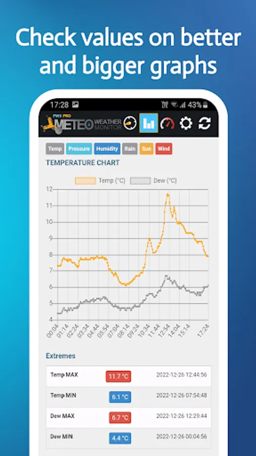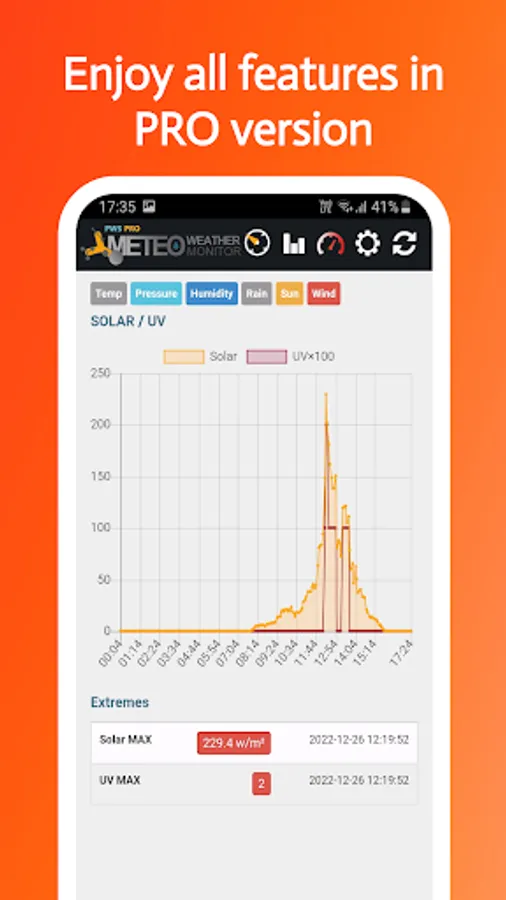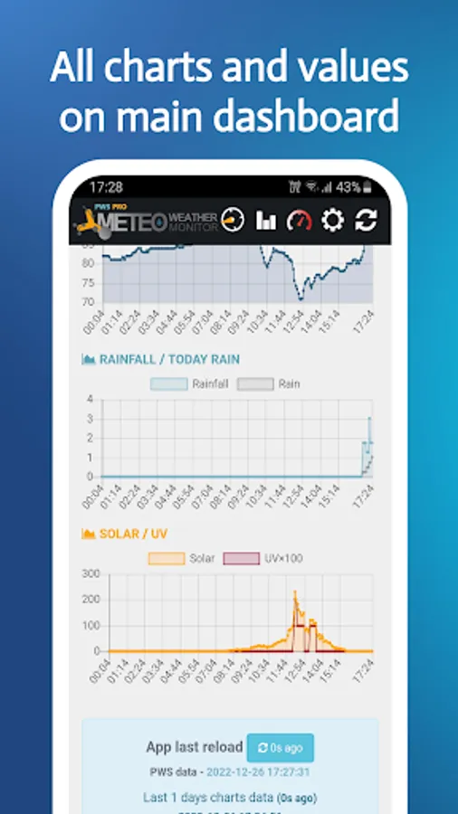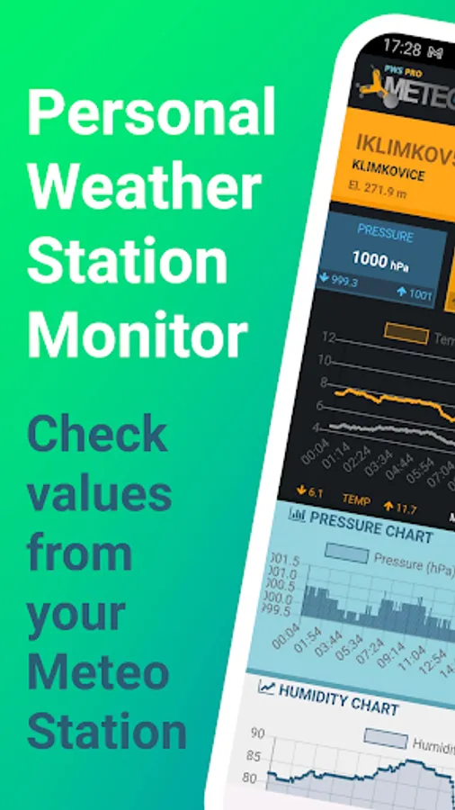 This unofficial app shows current and daily information from your Personal Weather Station. It's simple monitoring app with basic charts for checking actual values from PWS. No ads version.