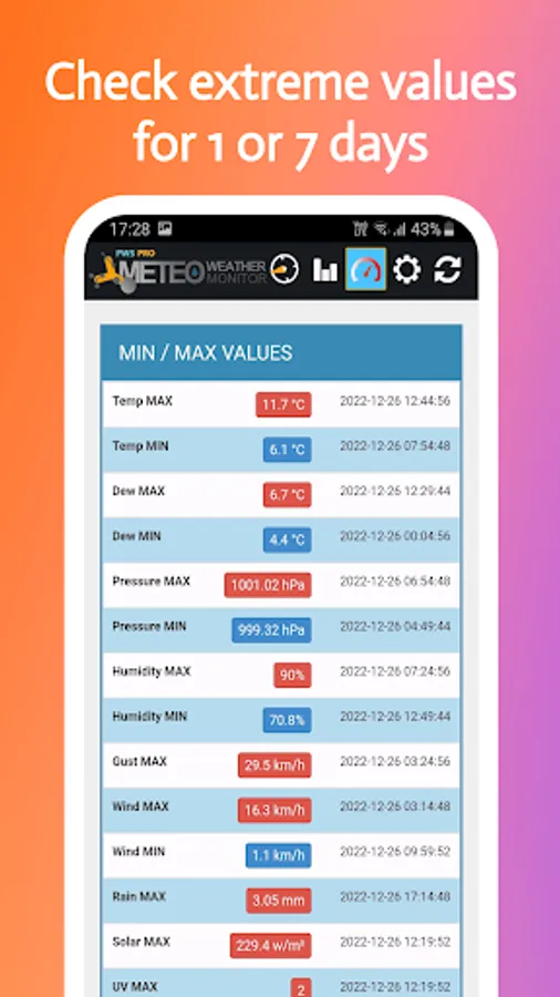 - MIN/MAX for temperature, dew point, humidity, pressure