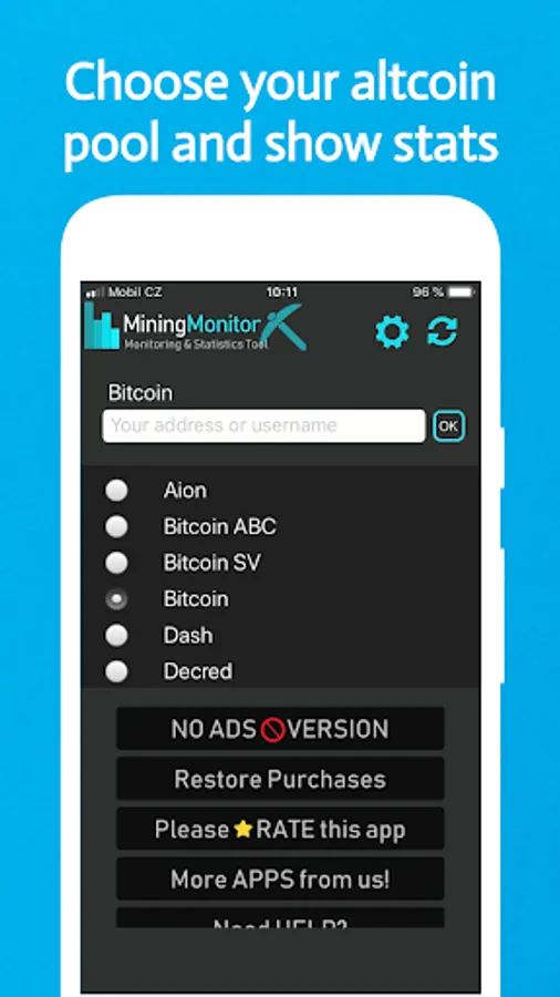 This is unofficial monitoring application for checking your mining progress and statistics information on F2pool for these altcoins BTC, LTC, ETH, ETC, SC, SCC, ZEC, XMR, DASH, XMR, XZC, AION, GRIN.