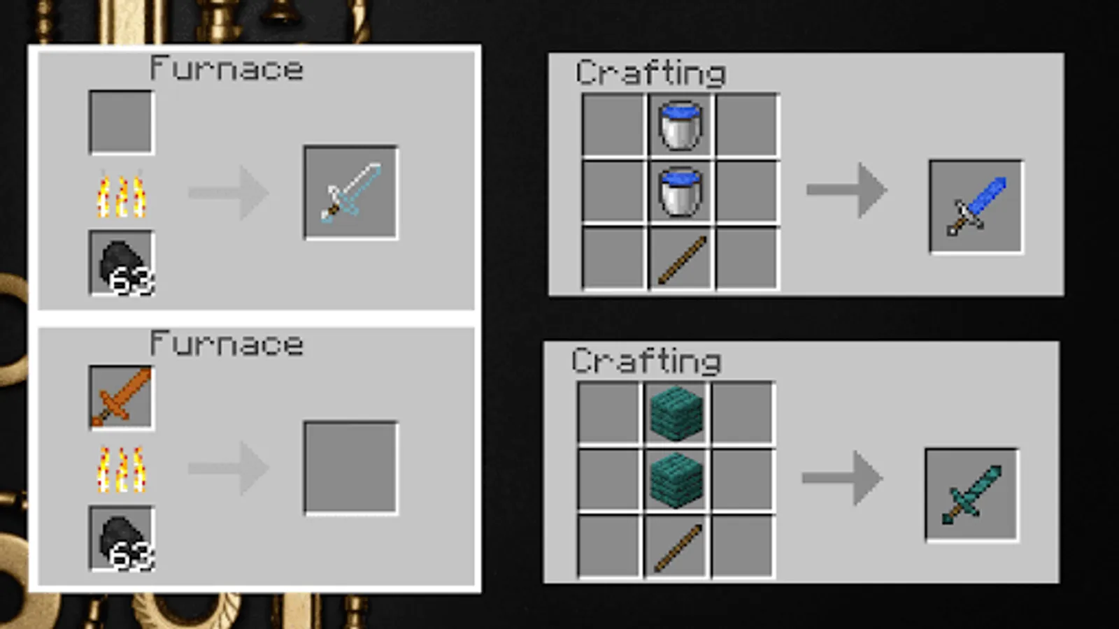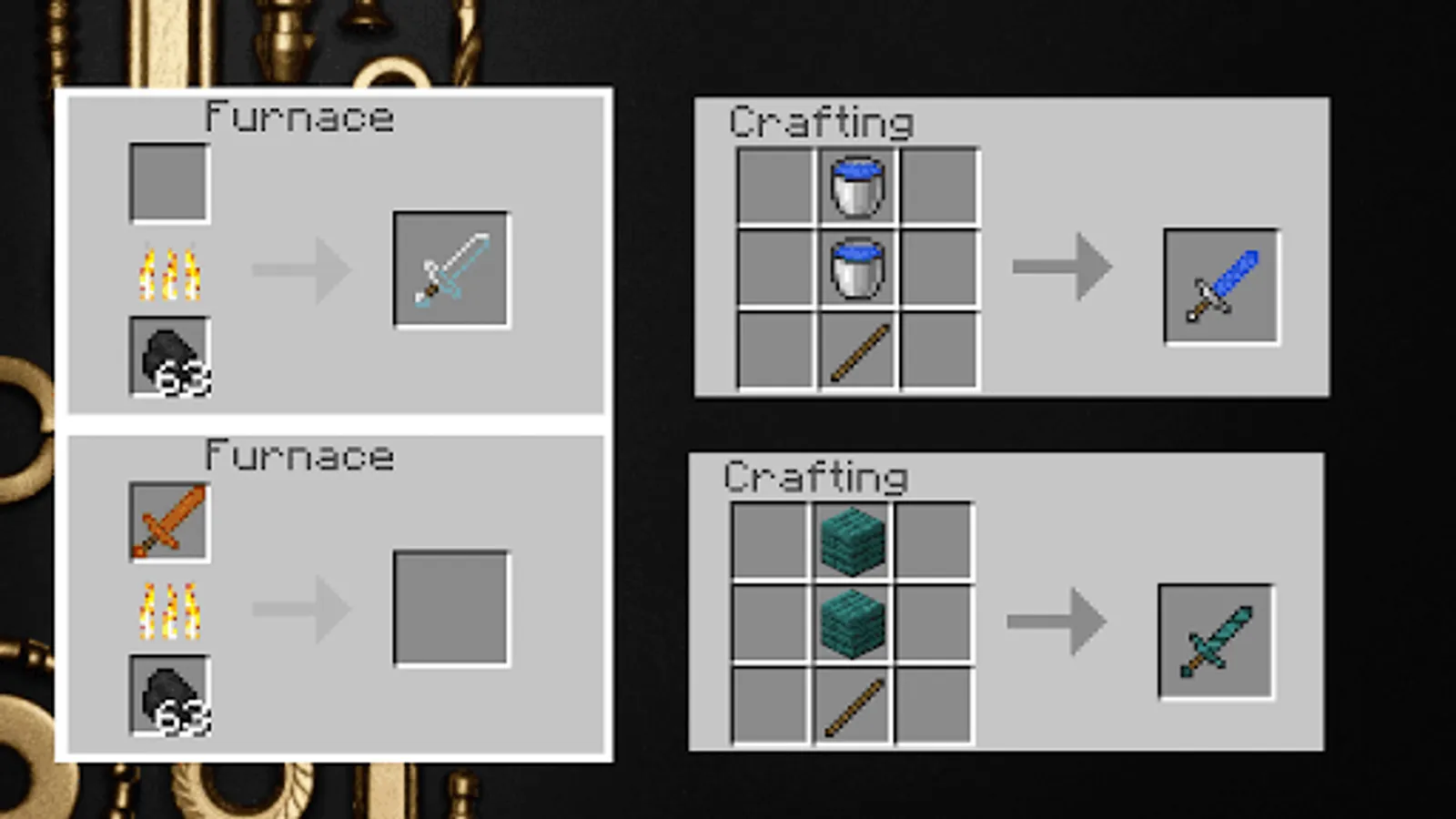 In another crafting mod - Ruby - sword, Ruby - peak, Ruby - axe, Ruby - hoe, Ruby - shovel, Ruby - Labrys, Ruby - helmet, Ruby - bib, Ruby - pants, Ruby - boots. All this also applies to Sapphires, Sapphire - sword, ..., Sapphire - helmet ...