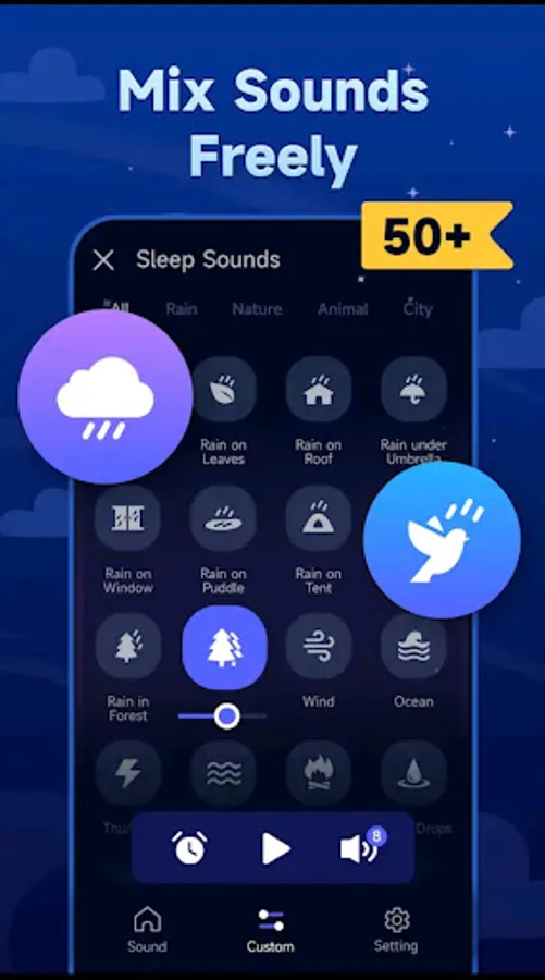 Sleep Sounds brings great collection of HD sounds that can be mixed into the perfect relaxing ambiences. You can choose from different types of rain, nature sounds, city sounds, white noise or instruments. Save your favorite sound mixes so they are always by hand with you.