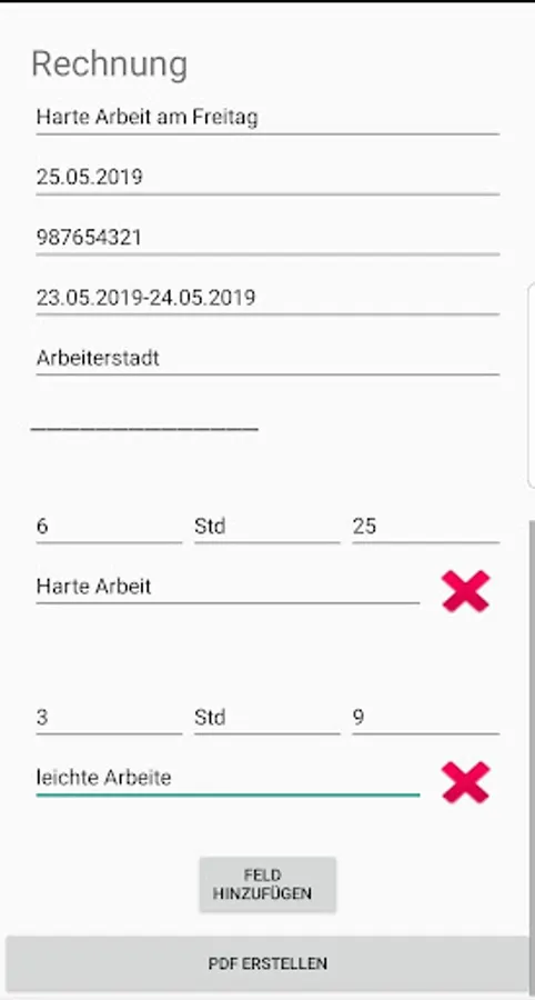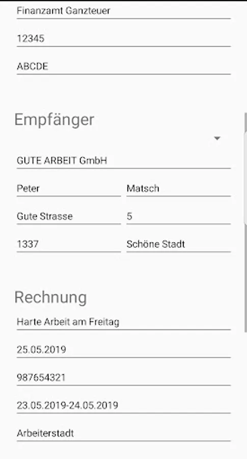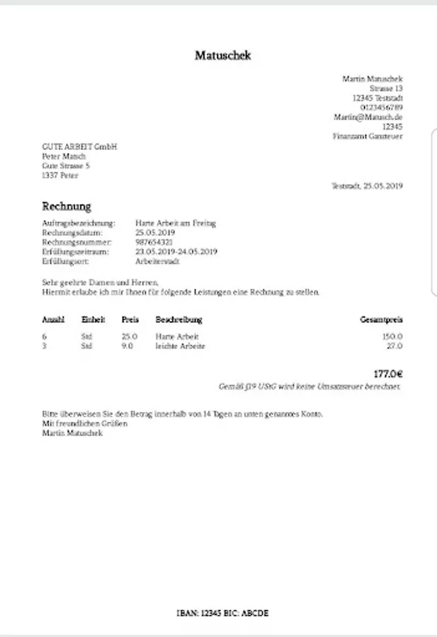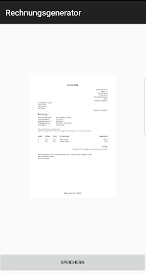 With this app you can easily and quickly create a very professional bill. The finished invoice will be saved as a PDF in a folder called "invoices" on your phone.