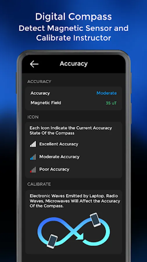 This application supports a device with a sensor. Here is a request with any application that supports digital compass. The compass app depends on the performance of your device exactly. If the compass works perfectly, it means that your sensors are perfect, too. Display senor status with device condition.