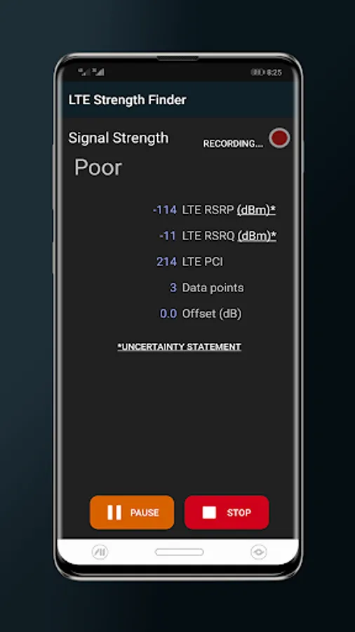 5G/4G signal test app cover cellular LTE network where you can get red and green button with detail line chart. When you want to find your phone signal just click on recording button and start finding LTE signal strength.