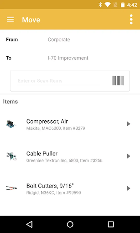 This application delivers mobile functionality to the field and warehouse teams. Field features include Search, Move, Verify, and Request. Warehouse features include Search, Transfer, Express Check In/Out, Count Inventory, Pick Tickets, and Create/Edit Items.