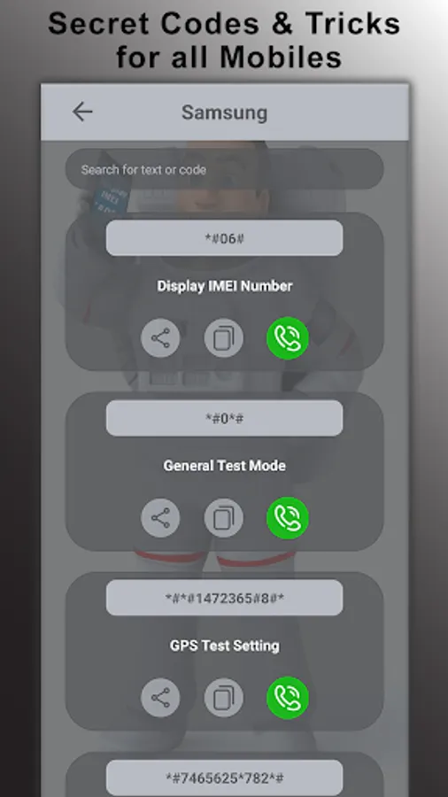 -- Through Secret Codes for All Mobiles app, you can easily dial all these codes directly from the app or copy codes and paste in your dialer to get the information.