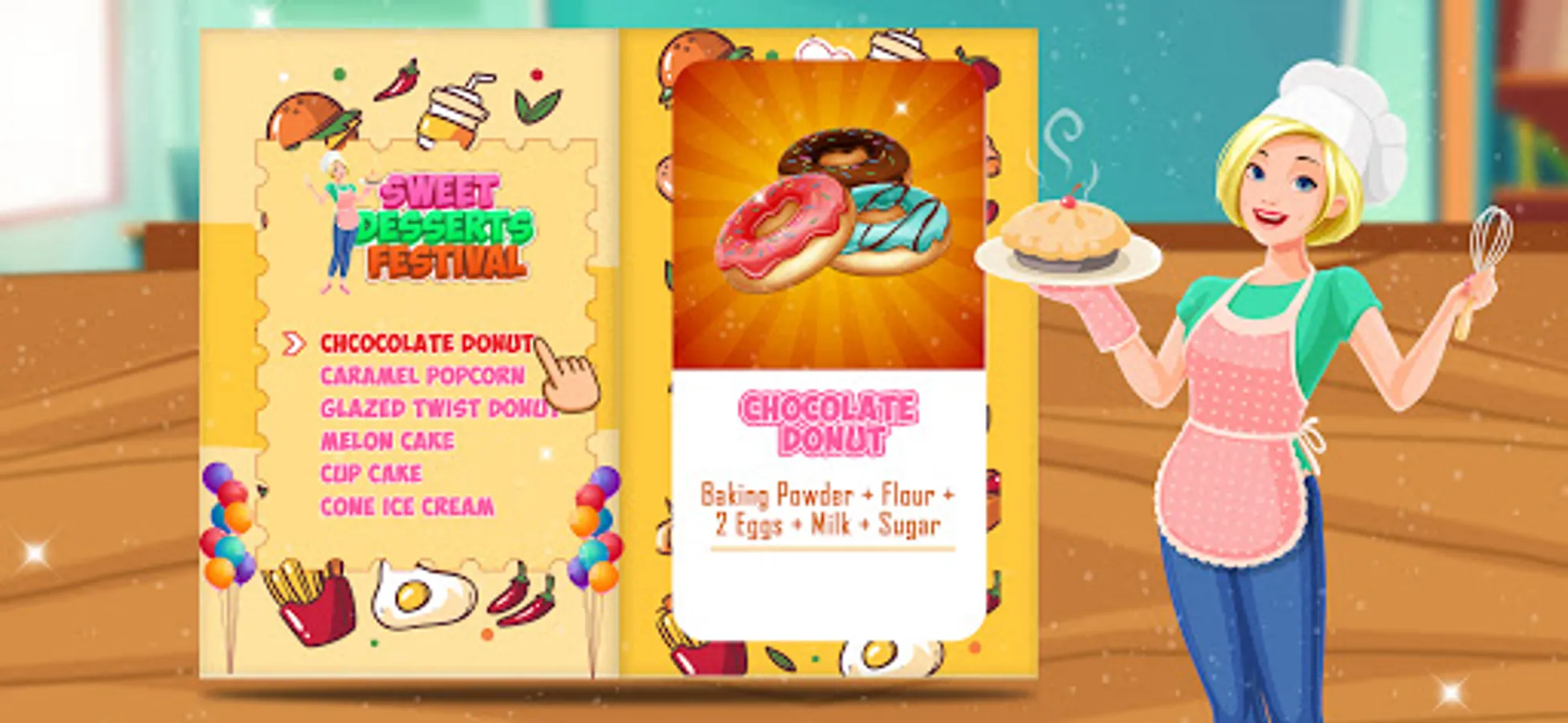 Channel your inner sweet desserts maker when you open the sweet food cooking recipes book. Sweet recipes fun cooking game brings you the collection of the largest food cake baker bakery cake recipes around the whole world. Be the best dessert chef in this ice-cream sandwich bakery cooking game. Do you love cooking bakery things and want to become the best bakery chef? You will definitely be tempted to eat your desserts first. Make sure your sweet desserts turn into the prettiest in all donuts, cupcake and bakery food games.