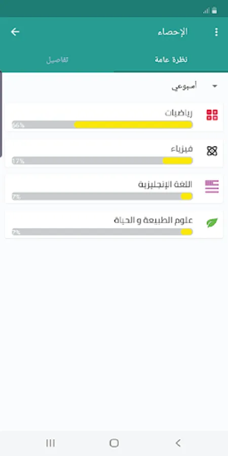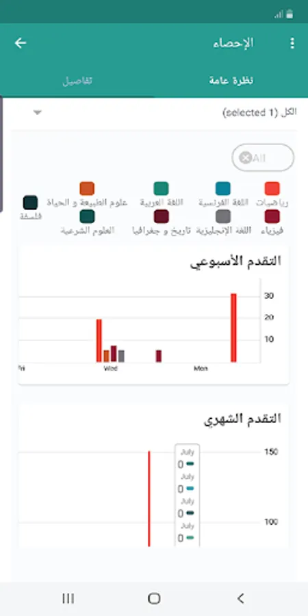 - Statistics: through which the student is able to track the development of his academic achievement in all subjects through the curves of weekly and monthly progress.