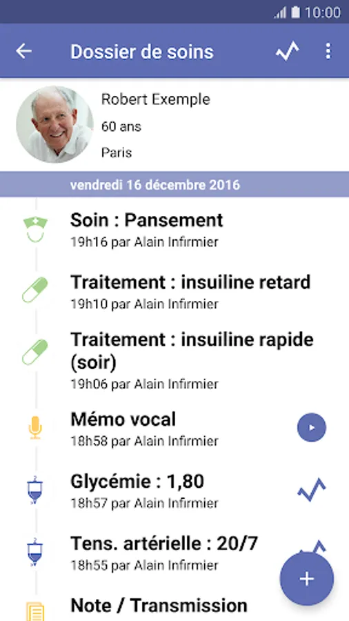 Are you a nurse? Create care records directly from your smartphone, at the patient's bedside. The app allows you to record care, treatments, biological constants, care diagrams and wound photos in the blink of an eye to enrich your patients' care records. The data can then be exported in PDF format.