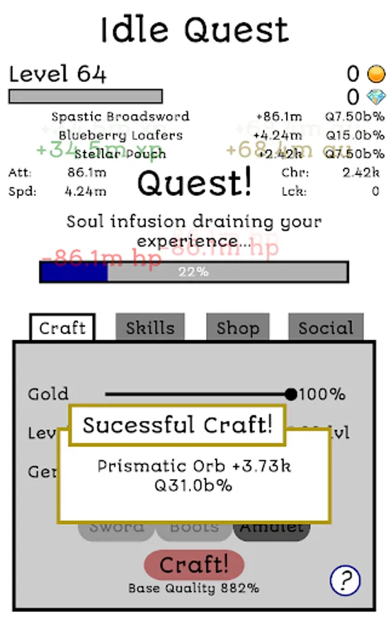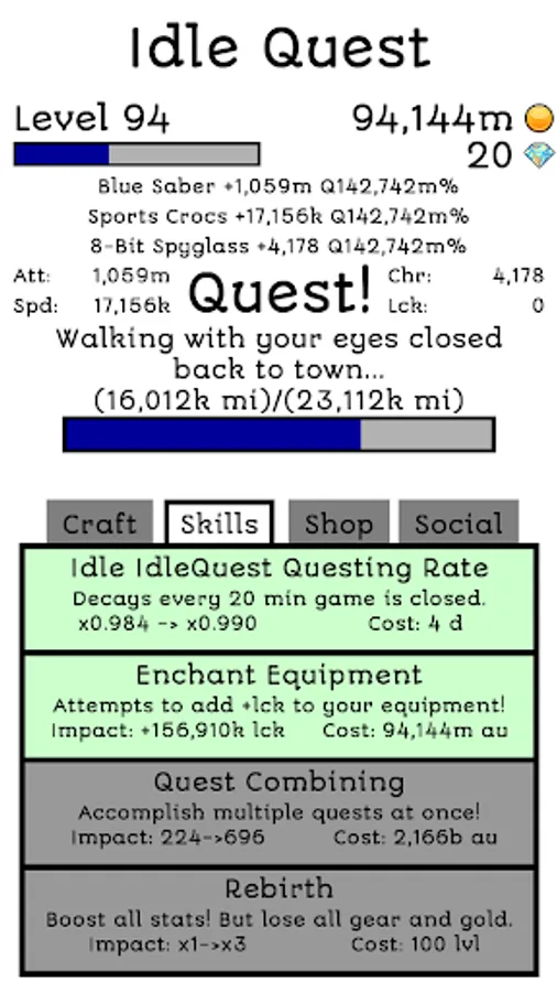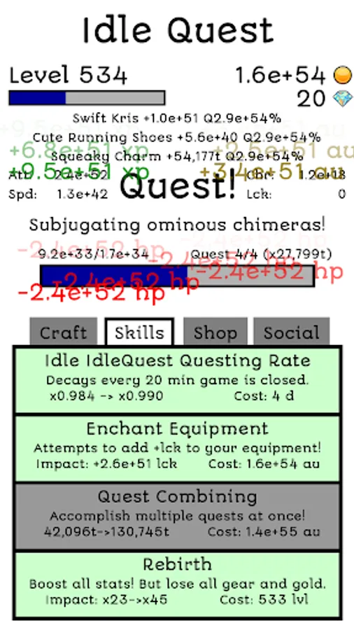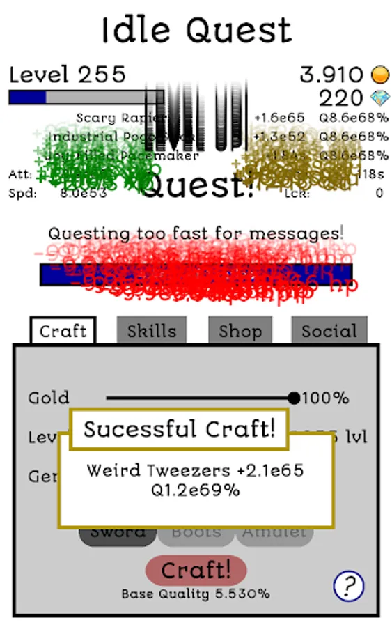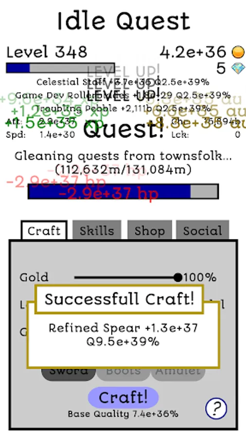Questing! It's what we love, and it's what we do. Begin by getting quests from townsfolk. Then, scurry to the designated questing location with the footgear of your choice. Once there, slay the needed monsters with a flip of your sword, and return to town. Charm the townsfolk with your magical amulet and collect massive piles of gold! Use your newfound loot to craft new gear, letting you tackle with ease the next challenging quest...