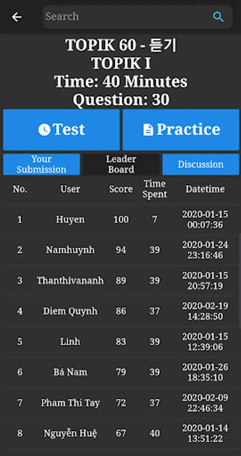 - In addition to the above main functions. The app also shows a Leader Board that obtained the highest score for each test. Users can exchange learning experiences with each other by posting comments in the discussion tab.
