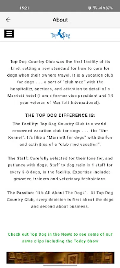 The Facility: Top Dog Country Club is a world-renowned vacation club for dogs . . . the “Un-Kennel”. It’s like a “Marriott for dogs” with the fun and activities of a “club med vacation”.