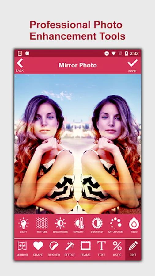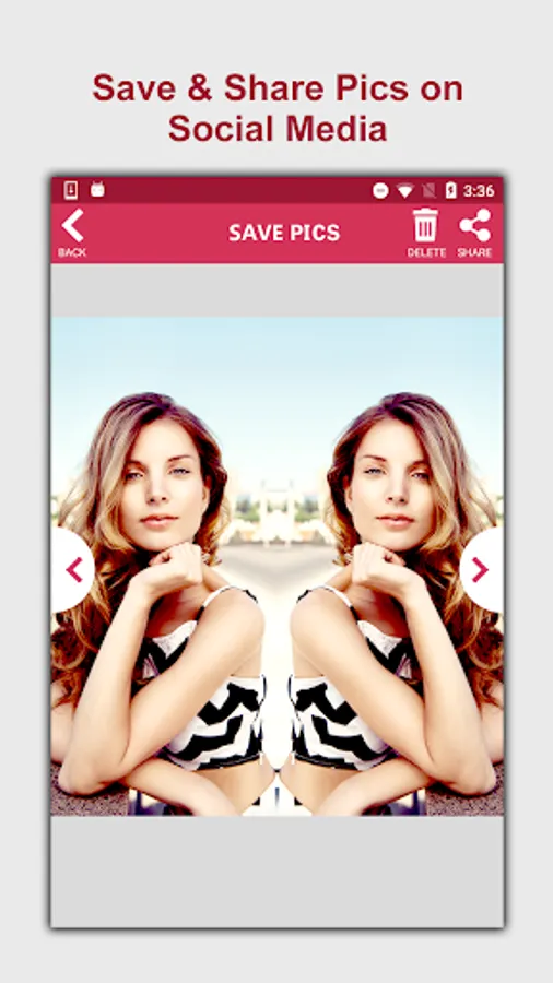 Mirror Image editor. Apply several photo effects and photo frames to these mirror photos. you can also collage your photo with collage function which you can marge up to 10 photos together.