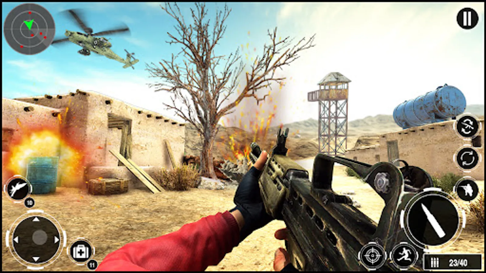 This harsh desert environment make it more interesting to play the offline guns simulation. The interesting gameplay begins with a helicopter making you ready for landing in desert with amazing guns. Jump from the helicopter in new guns simulation games. After your safe landing, you must find yourself a shield that will protect from the firing of opponent soldiers. After that, you will take your enemies one by one in new war guns simulation. You must keep in mind that if the mission is failed than you will not survive in the new offline guns simulation game.