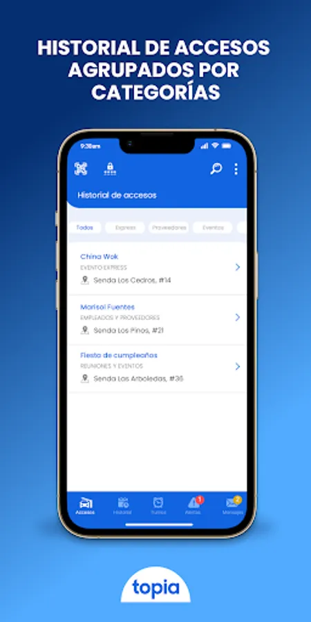 Topia Security allows you to keep a historical record of all accesses, whether by residents or visitors, allowing you to create reports and specific searches for income.