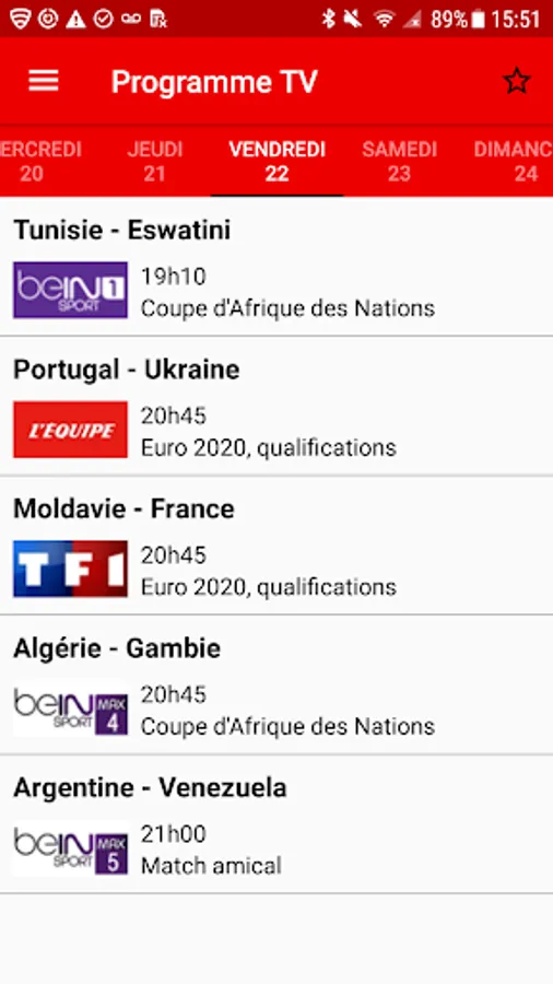 TV football program, locate the daily TV program matches broadcast live and rebroadcast.