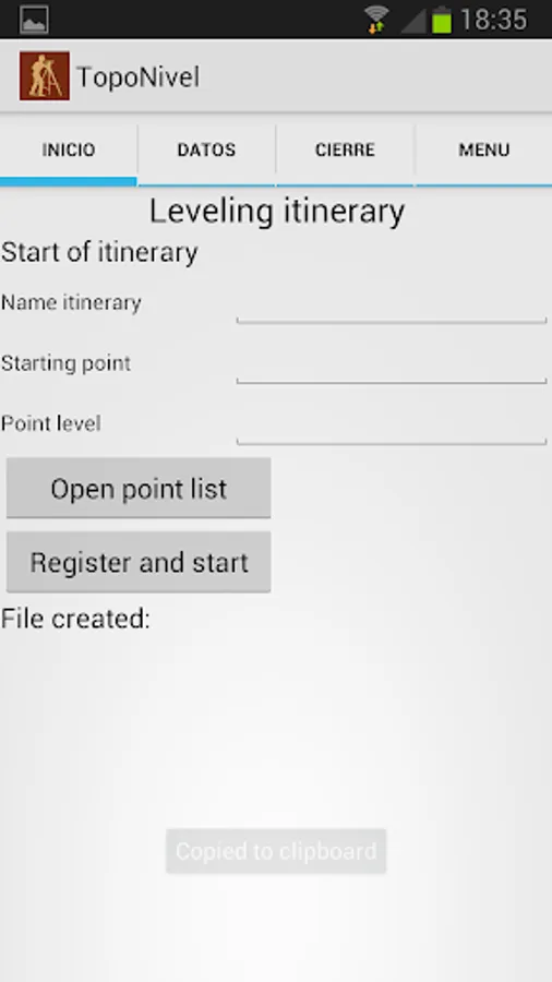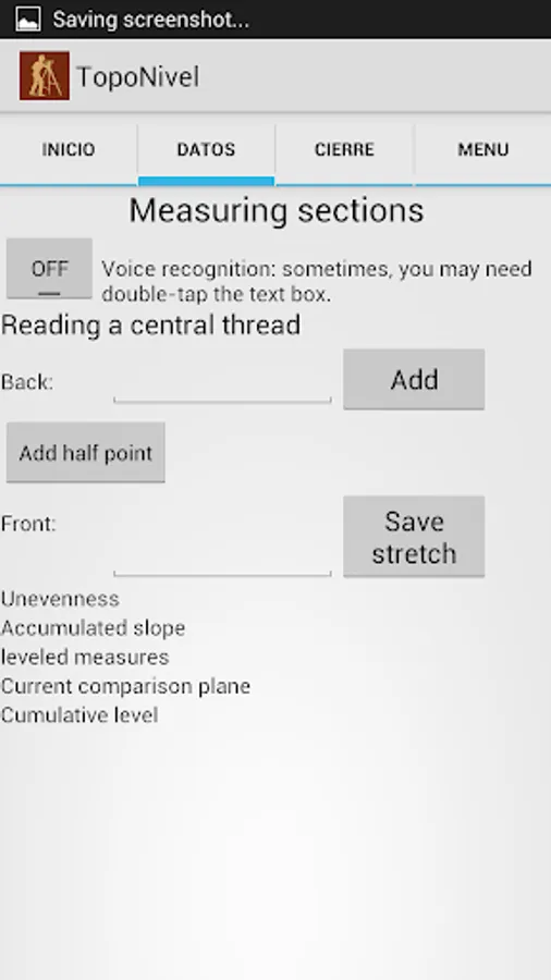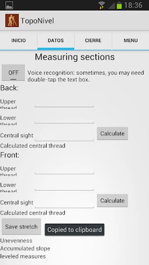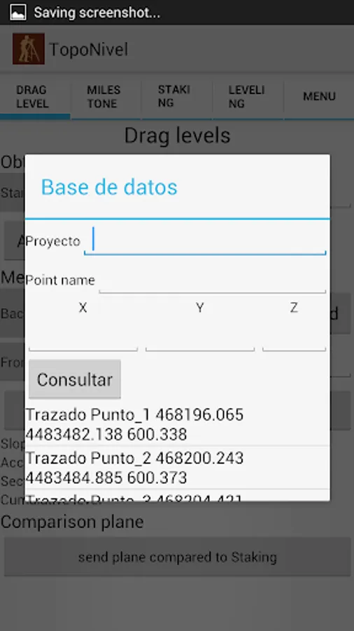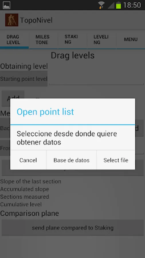 - Drag and closing levels: using leveled to reach the work area. In the case of drag, to reach the area, calculate our comparison plane and send it to the stakeout tab. To close, we will have all the necessary functions to start the journey back, and get to our starting point, calculating the closure of leveling.