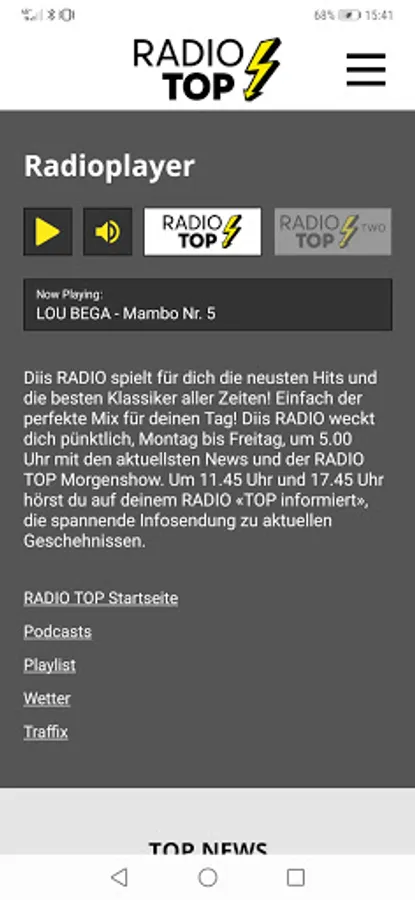 The TOP ONLINE app convinces with a tidy design and simple operation. It was reduced to the bare essentials: news articles from the online editorial team, a player for RADIO TOP and a live stream from TELE TOP.