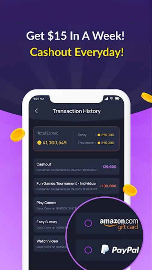 No fake cash. No minimum. Simply earn rewards, and cashout any amount at any time!