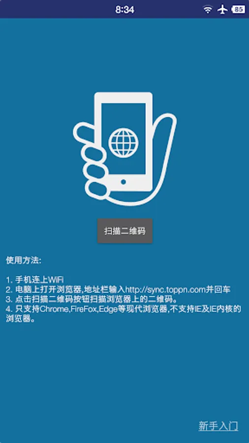 Let's get started! Connect the mobile WiFi, open the browser on the computer, input http://sync.toppn.com, and then use the phone to scan the screen QR code, done!
