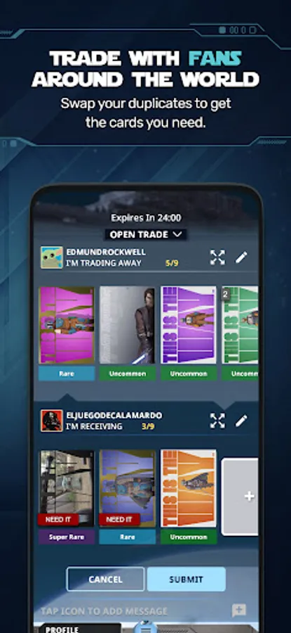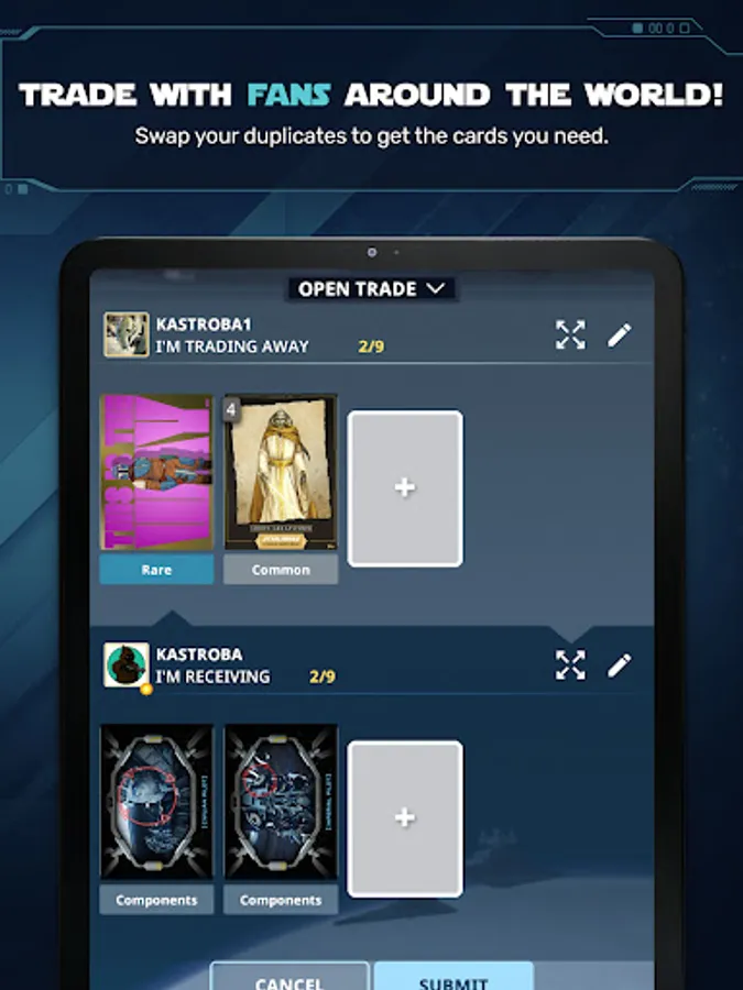 Collect & trade your favorite Star Wars™ characters, weapons, spacecraft, moments, and more with fans across the galaxy in the Star Wars™: Card Trader by Topps digital collectibles app! Collectible content spanning the original Star Wars™ Saga movies to new Star Wars releases on Disney+! Star Wars™: Card Trader by Topps brings to life the entertaining and delightful collector experience to rip digital collectible packs every day, trade with Star Wars fans around the world, complete sets to earn rewards and much more. Explore a new world of collecting with Star Wars™: Card Trader by Topps.
